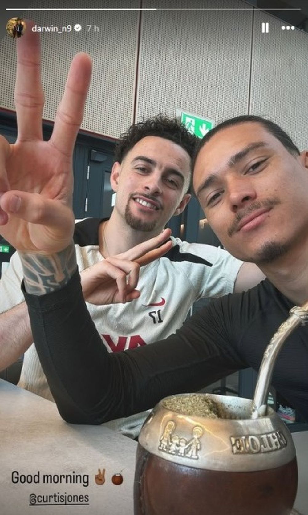 En Instagram, por su parte, el ex Peñarol se sacó una selfie con Curtis Jones con un mate y una V de victoria.