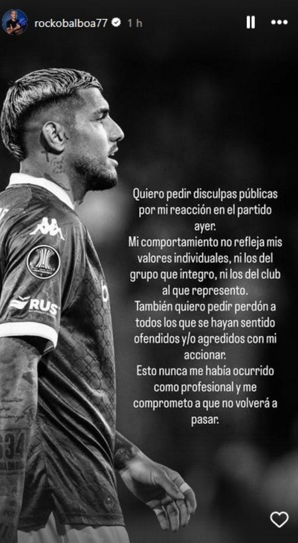 "Quiero pedir disculpas por mi reacción en el partido de ayer. Mi comportamiento no refleja mis valores individuales, ni los del grupo que integro, ni los del club al que represento", comenzó escriiendo.