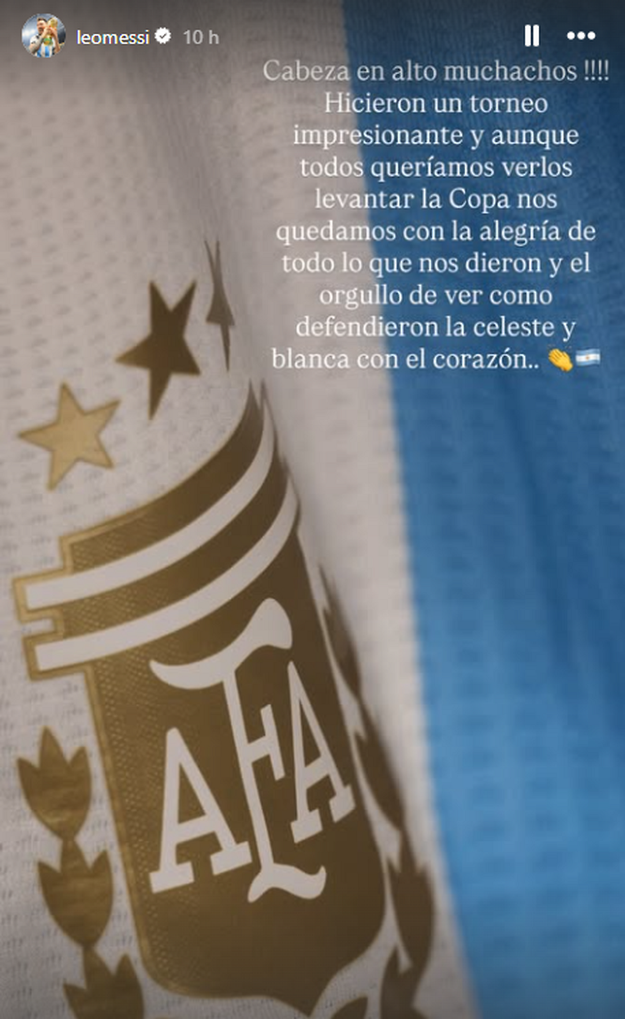 "Hicieron un torneo impresionante y aunque todos queríamos verlos levantar la Copa nos quedamos con la alegría de todo lo que nos dieron y el orgullo de ver cómo defendieron la celeste y blanca con el corazón", dijo Messi en un mensaje publicado con la camiseta albiceleste de fondo.