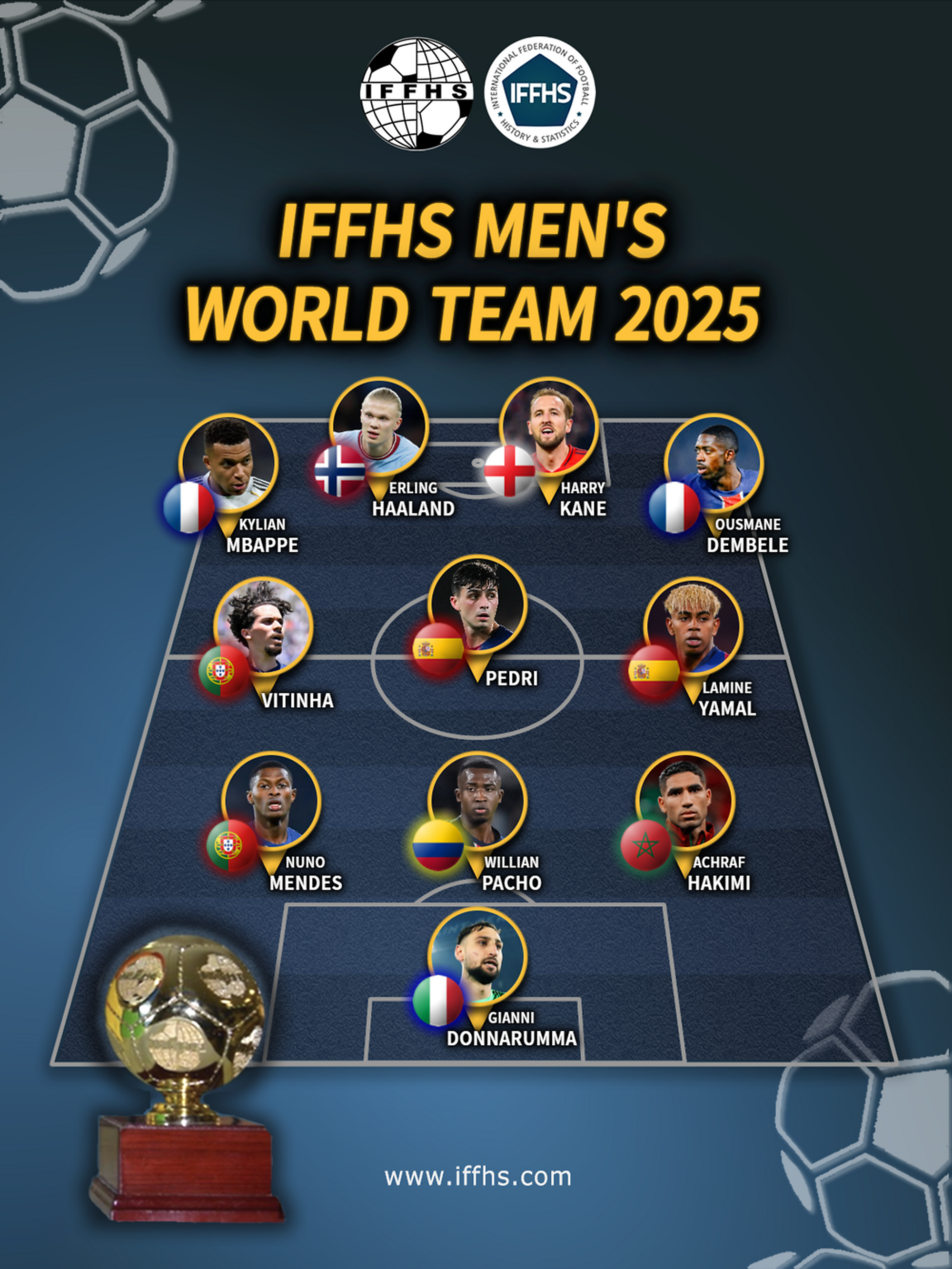 Con una formación de 3-3-4, los elegidos fueron: Gianluigi Donnarumma (Italia); Achraf Hakimi (Marruecos), William Pacho (Ecuador), Nuno Mendes (Portugal); Lamine Yamal (España), Pedri (España), Vitinha (Portugal); Ousmane Dembélé (Francia), Harry Kane (Inglaterra), Erling Haaland (Noruega) y Kylian Mbappé (Francia).