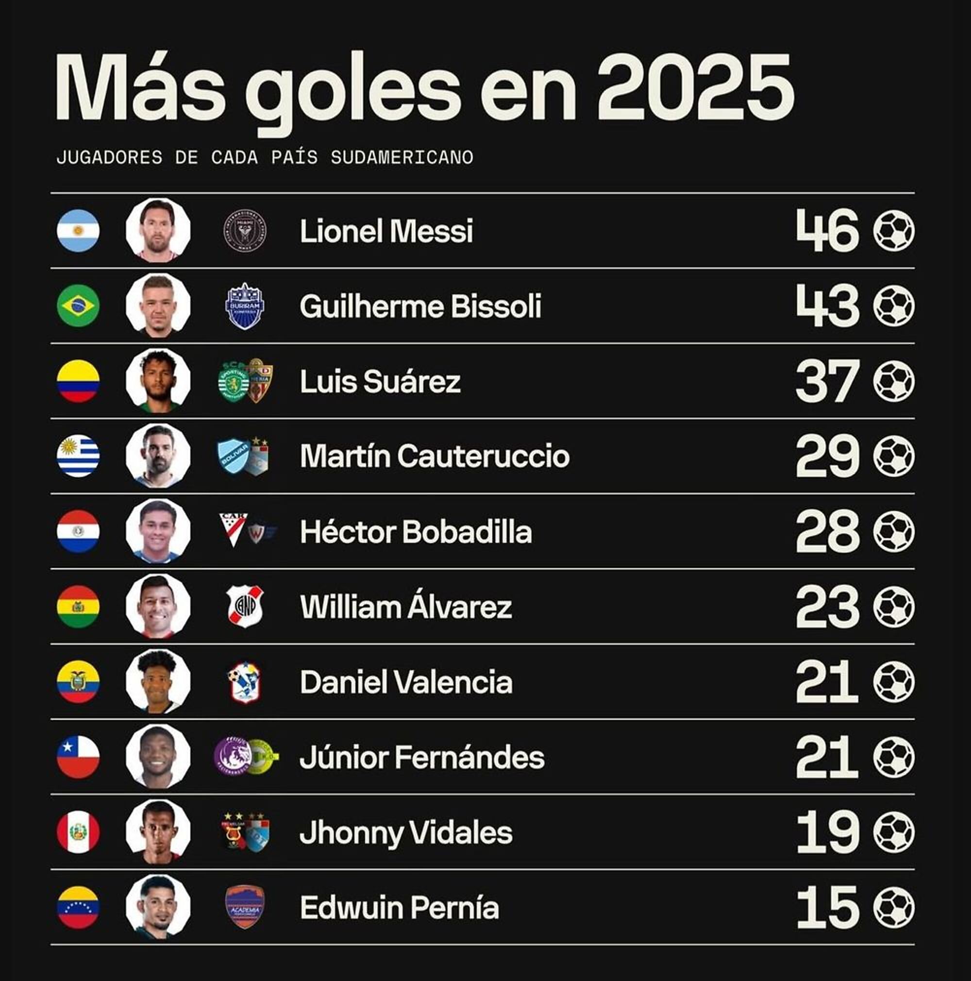 Según un estudio estadístico realizado por la página Sofascore, especializada justamente en estadísticas de jugadores, Lionel Messi fue el sudamericano que más goles anotó en 2025 con 46 para Inter Miami de la Major League Soccer (MLS) de Estados Unidos.