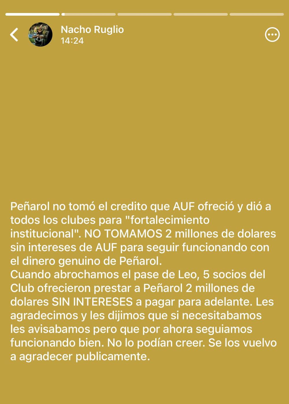 "Peñarol no tomó el crédito que AUF ofreció y dio a todos los clubes para fortalecimiento institucional. No tomamos US$ 2 millones sin intereses de AUF para seguir funcionando con el dinero genuino de Peñarol", dijo luego Ruglio en sus estados de WhatsApp.