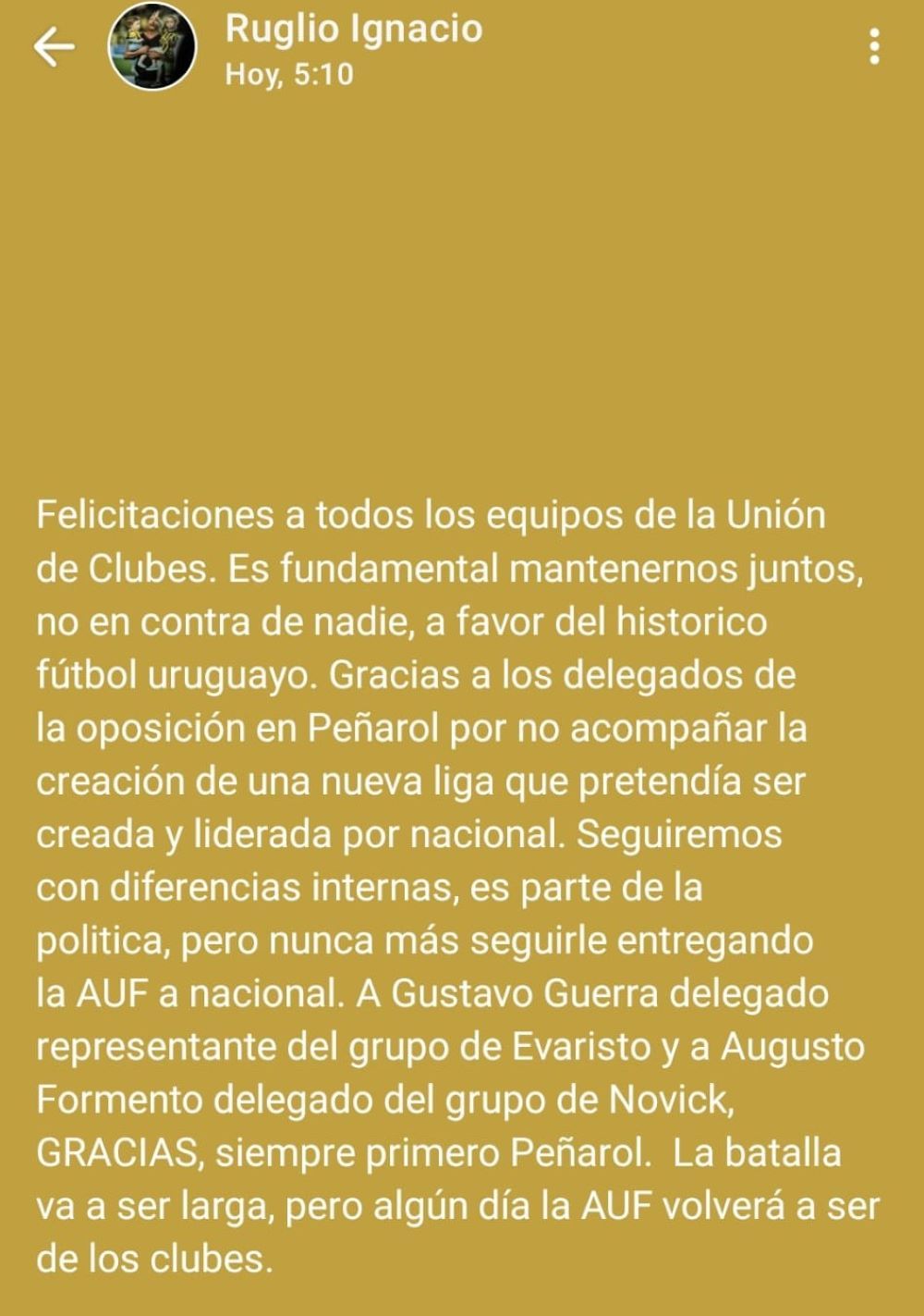 A su vez, finalizó escribiendo: "A Gustavo Guerra, delegado representante del grupo de Evaristo y a Augusto Formento, delegado del grupo de Novick, GRACIAS, siempre primero Peñarol. La batalla va a ser larga, pero un día la AUF volverá a ser de los clubes".