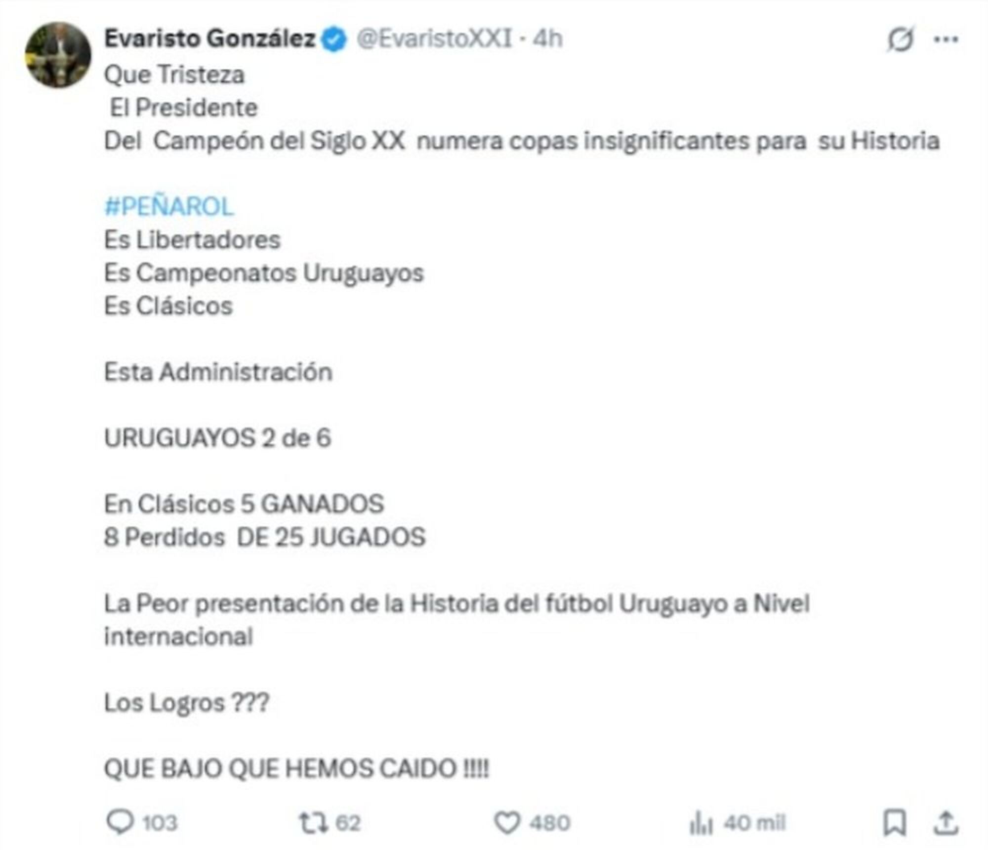 El consejero de Peñarol Evaristo González utilizó su cuenta de X para criticar con dureza la publicación que realizó el presidente Ignacio Ruglio a través de un estado de WhatsApp, reivindicando su gestión al frente del club para afirmar que es el presidente más ganador de títulos en el siglo XXI del fútbol uruguayo.